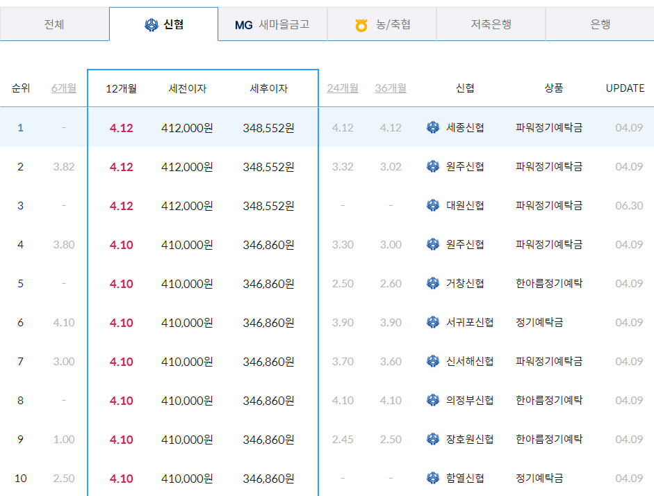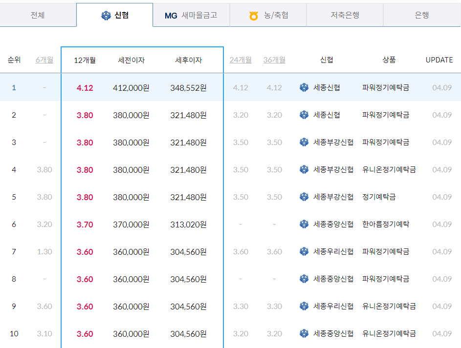 | 12개월 | 세종신협 본점 등 3곳 | 4.12% | 348,552원 | 방문가입 |
