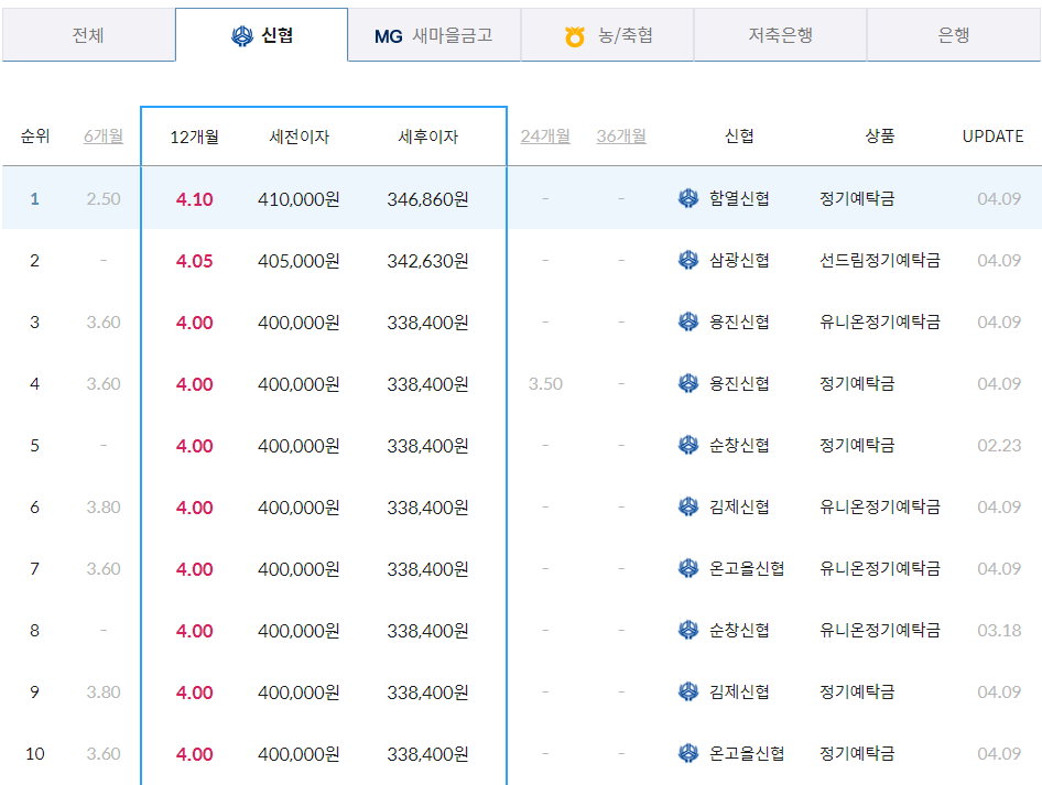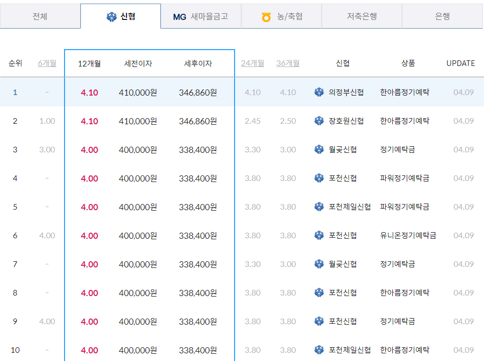 2024년 4월 지역별 신협 정기예금 금리 가장 높은 곳