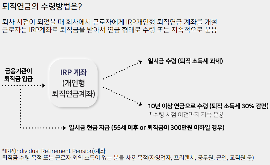 퇴직연금 수령방법에는 다양한 옵션이 있습니다.
