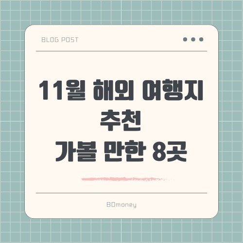 11월에 떠나기 좋은 해외여행지 8곳을 소개했습니다. 각 여행지마다 특색 있는 경험을 제공하므로, 취향에 맞게 선택하여 즐거운 여행을 계획해보세요.