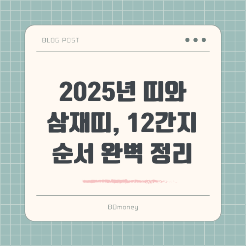 2025년은 어떤 띠의 해일까요? 이번 포스팅에서는 2025년 띠, 삼재띠, 그리고 12간지 순서에 대해 상세히 알아보겠습니다.