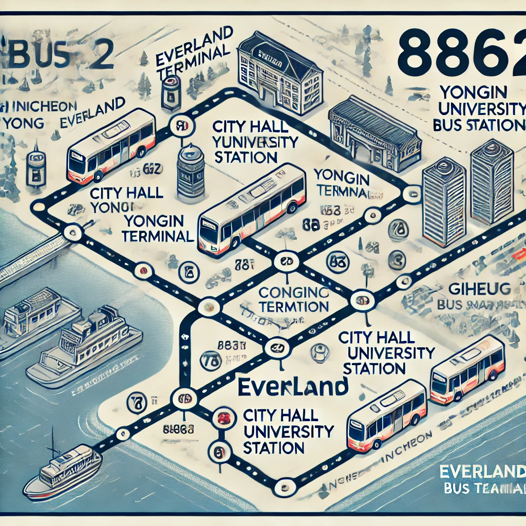 8862번 버스는 인천에서 용인까지 다양한 정차역을 거쳐 가는데요, 주요 경로는 다음과 같아요.