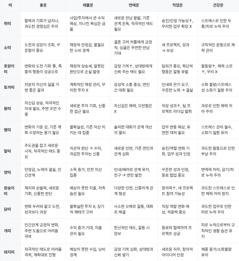 | 토끼띠 | 인간관계에서 갈등 반복. 휴식과 내면 성찰 필요 |